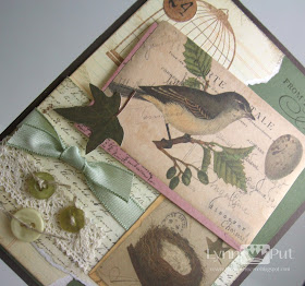 I used a K&Company kit by Brenda Walton which contained vintage looking die cut bird pieces and combined them with a stamped Papertrey birdcage image (Love Birds), a Stampin' Up sentiment (Watercolor Trio) and some My Mind's Eye designer paper.