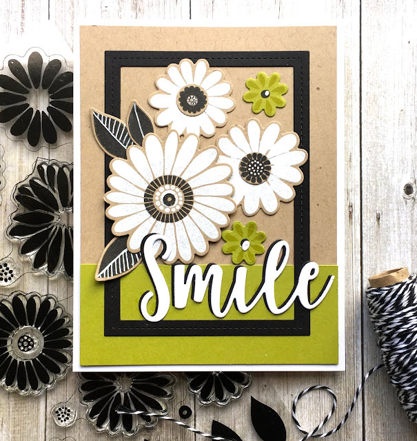 I recently ordered and received the new My Favorite Things All Smiles Card Kit and I was excited to ink it up and create a card using it.  So I used this week's CTD colors along with the color black as a neutral and created my first All Smiles card.  I used a white card base, then a panel of kraft cardstock with a strip of simply chartreuse along the bottom.  Next I die cut a black frame using the Single Stitched Line Rectangle Frames and die cut two Smiles one in black and one in white and glued them together slightly off so that the black would act as a shadow.  After that, I used white embossing powder and heat embossed my three main flowers on kraft cardstock then stamped the centers in black ink.  I stamped the leaves in black ink and did some line work on them using a white gel pen and also added some white pen detail on the centers of the flowers.  I stamped and die cut two green flowers and stamped the centers black and added all of my flowers and leaves to my card front, popping up the largest flower with foam tape, and then glued on my die cut Smile.  I stamped the other half of my sentiment inside the card.  Now that I look at this card I think I'll go back and add a few black rhinestones or enamel dots.