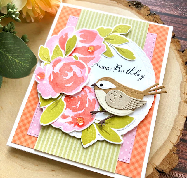 For my roses, I stamped them in pretty in pink ink then stamped off before stamping on my die cut piece then stamped the second layer in calypso coral ink stamped off and then I went back to roll just the edges of the first solid flower stamp in pretty in pink. I stamped the leaves in simply chartreuse and ripe avocado inks. Next I used the Love to Layer:Scalloped Circle dies and die cut the largest circle from white card stock. For my sentiment I use the happy birthday from the Feathered Friends Mini 3 stamp set. For my background papers, I use a coral gingham paper from Doodlebug Designs, a pale pink from Echo Park and the striped green from Papertrey Ink.