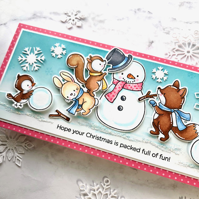 I stamped my sentiment along the bottom, added my images popping up the two outside critters and the stacked squirrel and bunny with foam tape and then added some white die cut snowflakes and some glitter along the bottom.