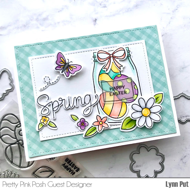 I used the new Spring Jar stamp set and coordinating Spring Jar dies to create an Easter card. To create my card, I started out by stamping and die cutting all of my images then coloring them using copic markers. I adhered the egg image inside the jar and then stamped the label and Easter sentiment onto vellum and die cut it out.